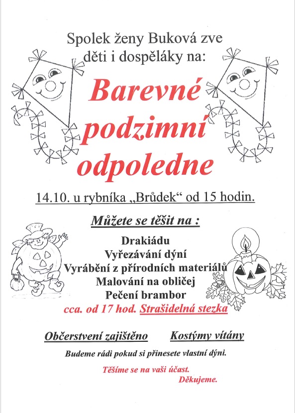 Spolek ženy Buková zve děti i dospěláky na barevné podzimní odpoledne v sobotu 14.října od 15:00 hodin u rybníka "Brůdek"